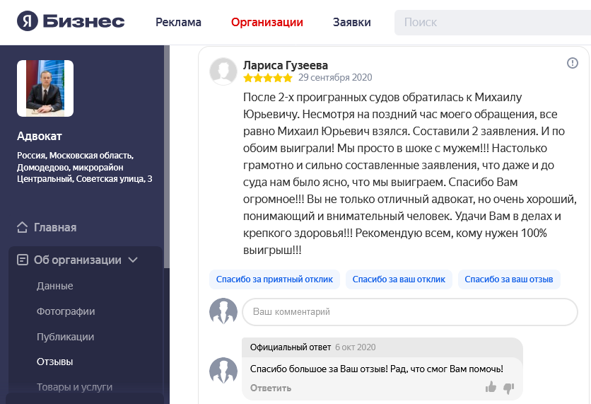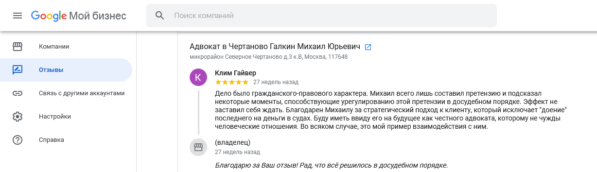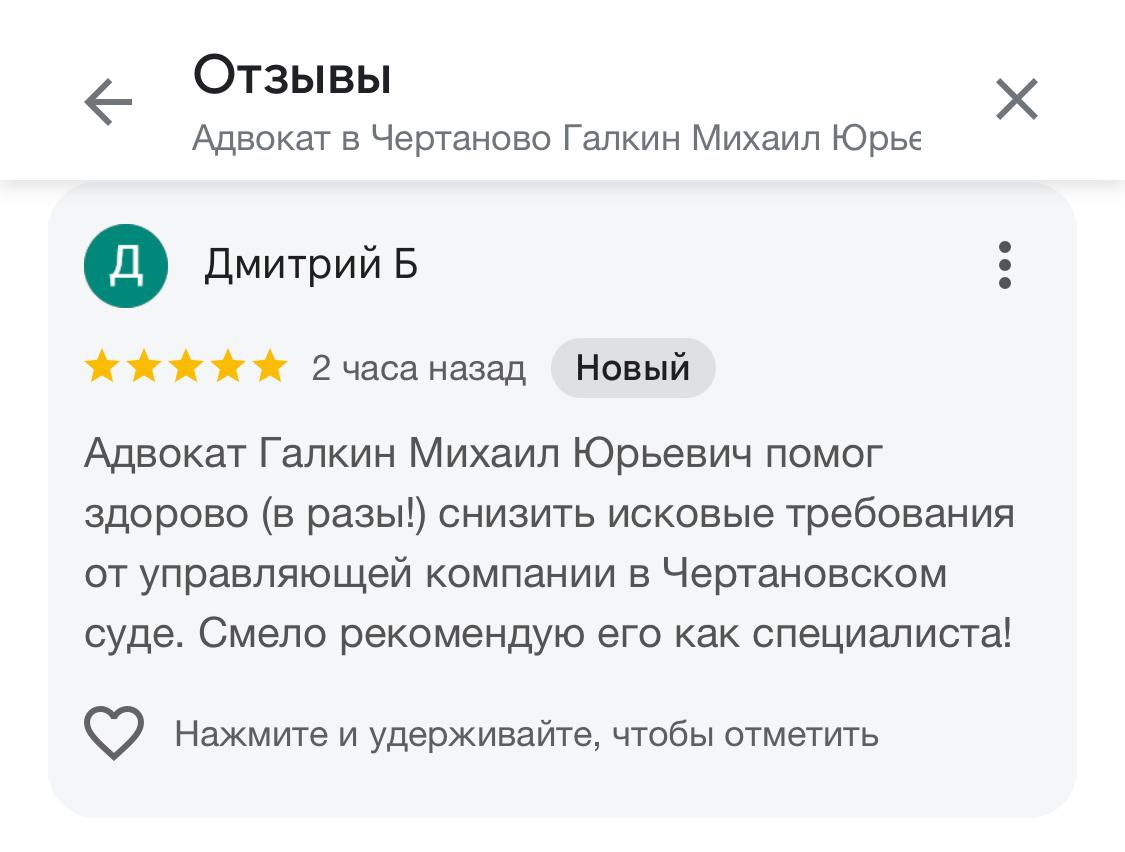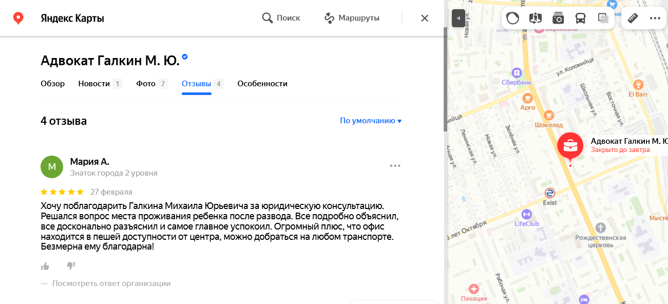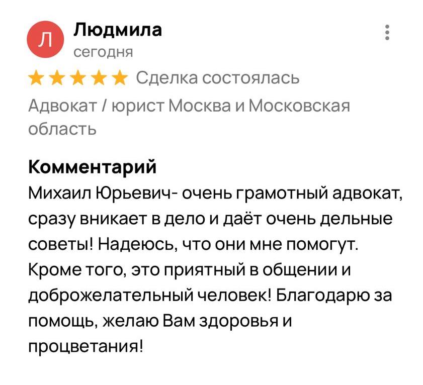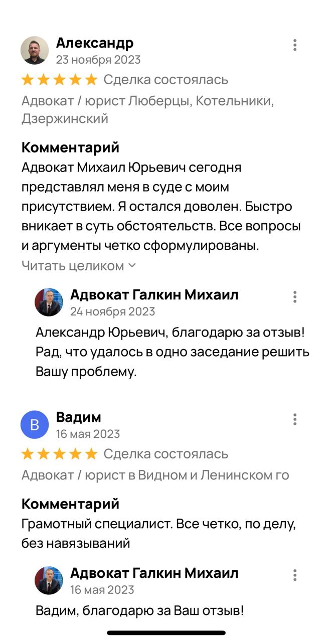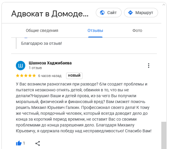 Многие потенциальные доверителя перед тем, как получить консультацию адвоката или заключить с ним соглашение об оказании юридической помощи, ищут отзывы об адвокате. Чтобы избежать сомнений в реальности отзывов, на сайте размещены скриншоты отзывов из Гугл и Яндекс, из социальных сетей.