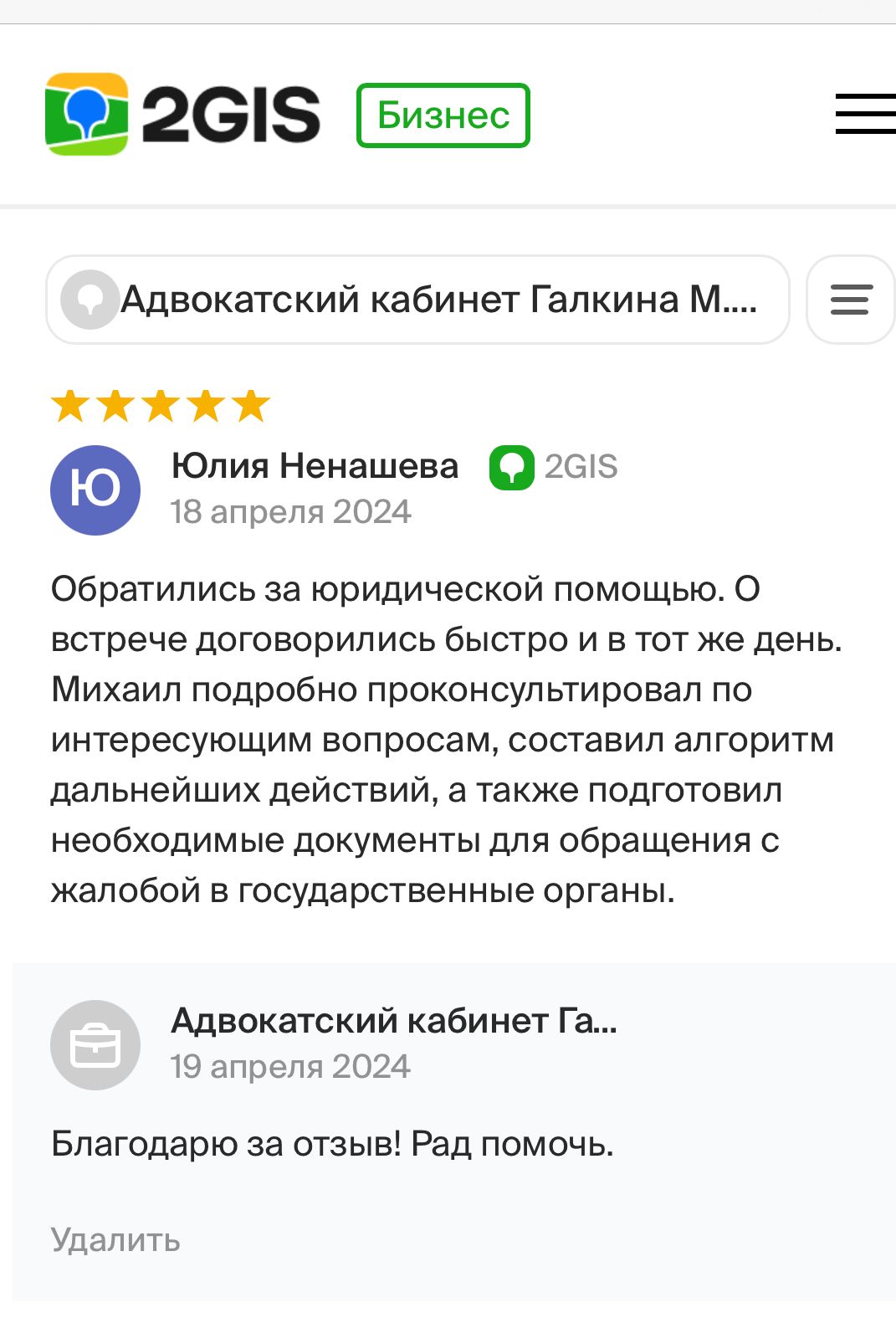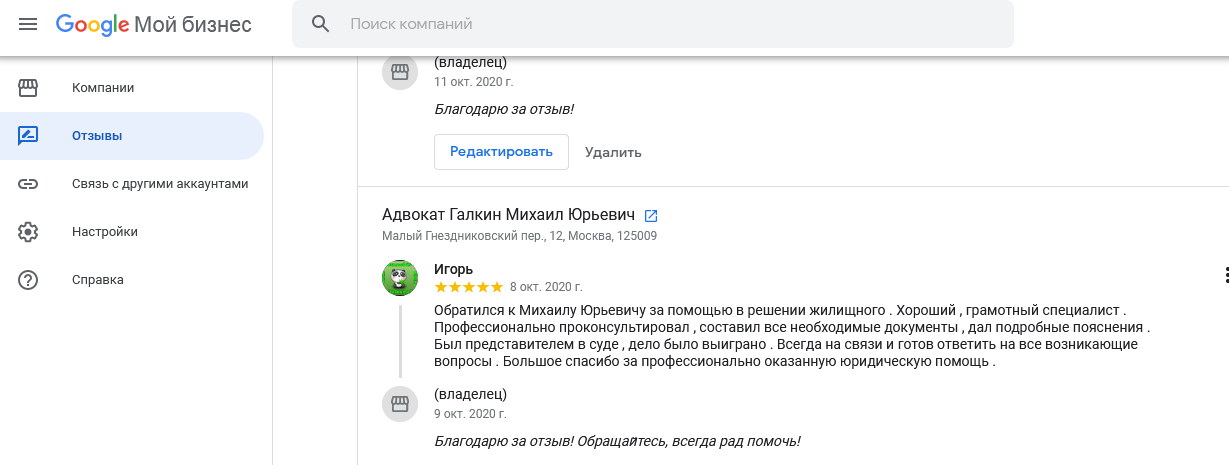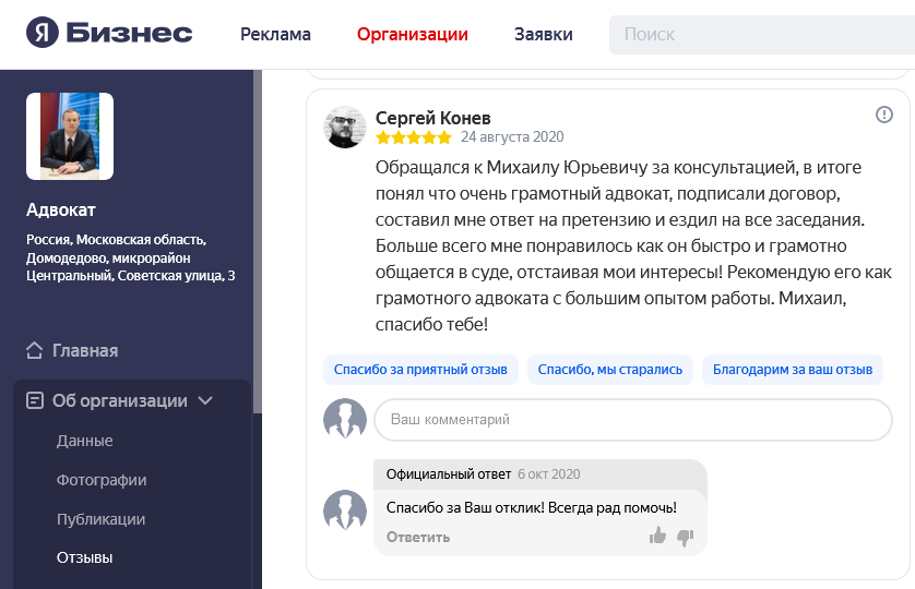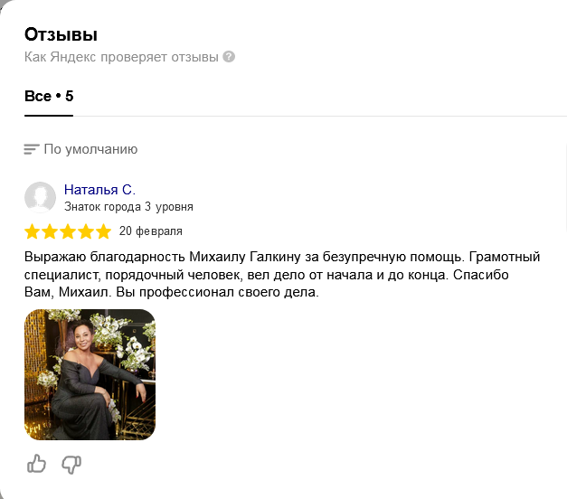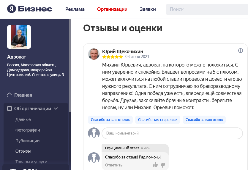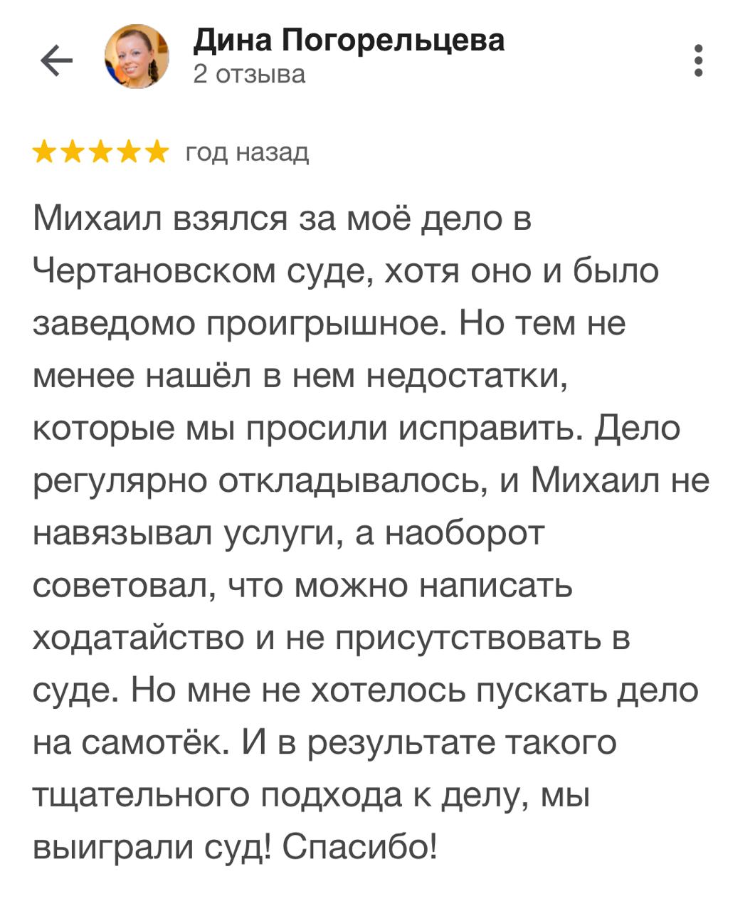 Многие потенциальные доверителя перед тем, как получить консультацию адвоката или заключить с ним соглашение об оказании юридической помощи, ищут отзывы об адвокате. Чтобы избежать сомнений в реальности отзывов, на сайте размещены скриншоты отзывов из Гугл и Яндекс, из социальных сетей.