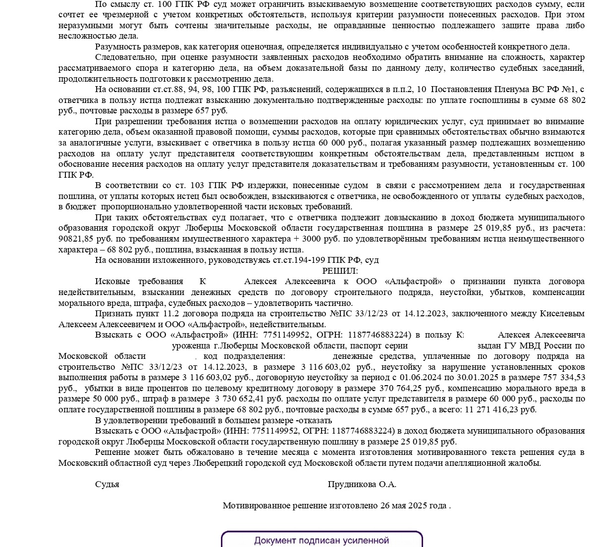 30.04.2025 года Люберецким городским судом Московской области решено взыскать с подрядчика денежные средства, уплаченные по договору подряда в размере 3 116 603,02 руб., неустойку за нарушение установленных сроков выполнения работы в размере 3 116 603,02 руб., договорную неустойку за период с 01.06.2024 по 30.01.2025 в размере 757 334,53 руб., убытки в виде процентов по целевому кредитному договору в размере 370 764,25 руб., компенсацию морального вреда в размере 50 000 руб., штраф в размере 3 730 652,41 руб. расходы по оплате услуг представителя в размере 60 000 руб., расходы по оплате государственной пошлины в размере 68 802 руб., почтовые расходы в сумме 657 руб., а всего: 11 271 416,23 руб.