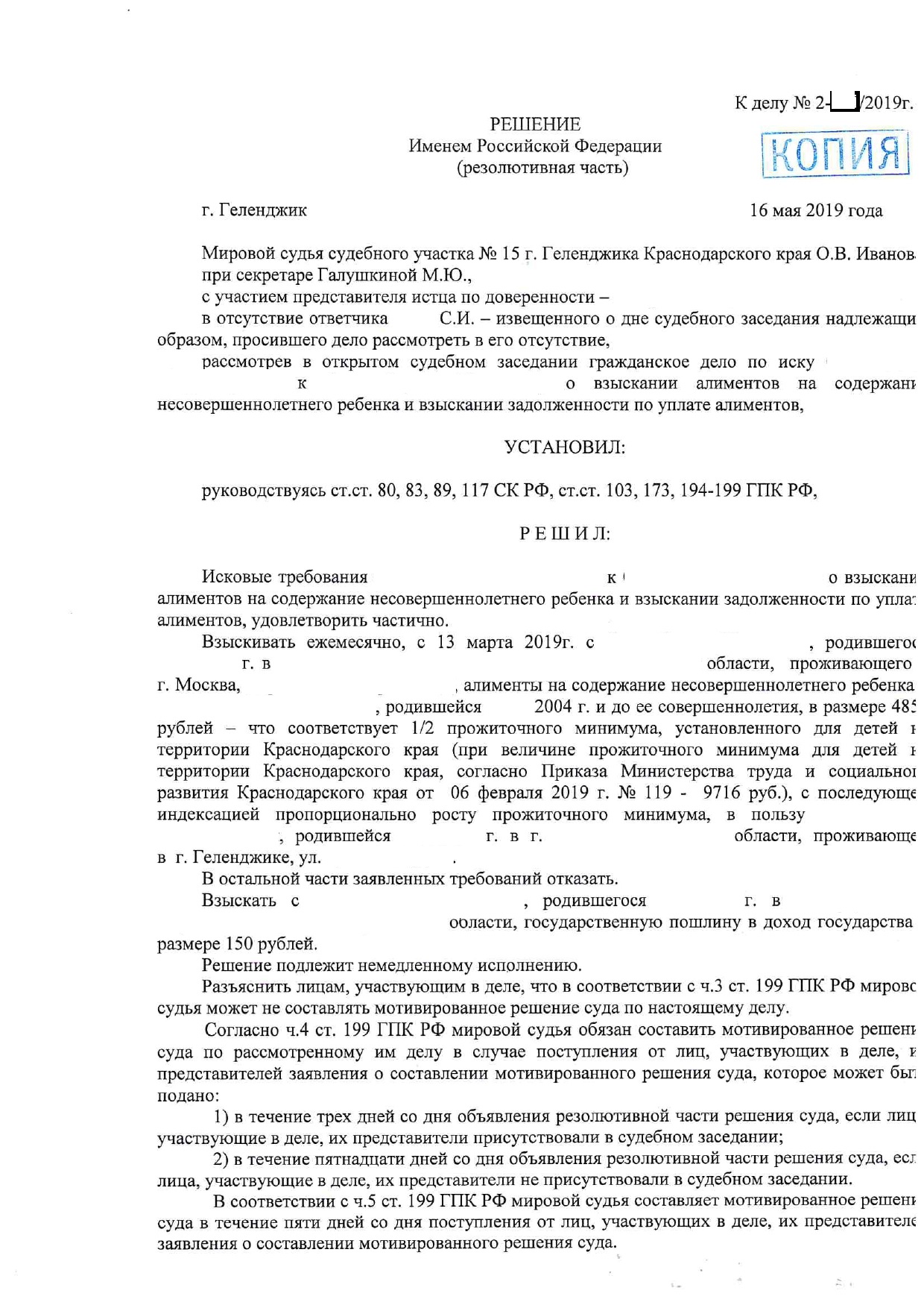 Результат моей работы: установлены алименты в размере 4 858 руб. в месяц (1/2 прожиточного минимума по Краснодарскому краю), во взыскании долга по алиментам с сентября 2017 года в размере 167 212 рублей полностью отказано!