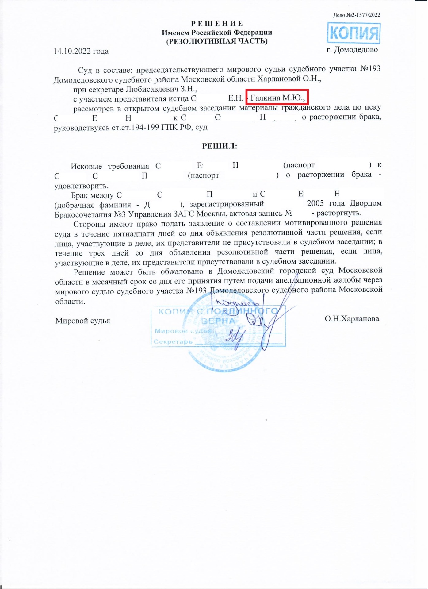 14.10.2022 мировой судья судебного участка № 193 города Домодедово произвёл развод супругов в судебном порядке, вынеся решение о расторжении брака.