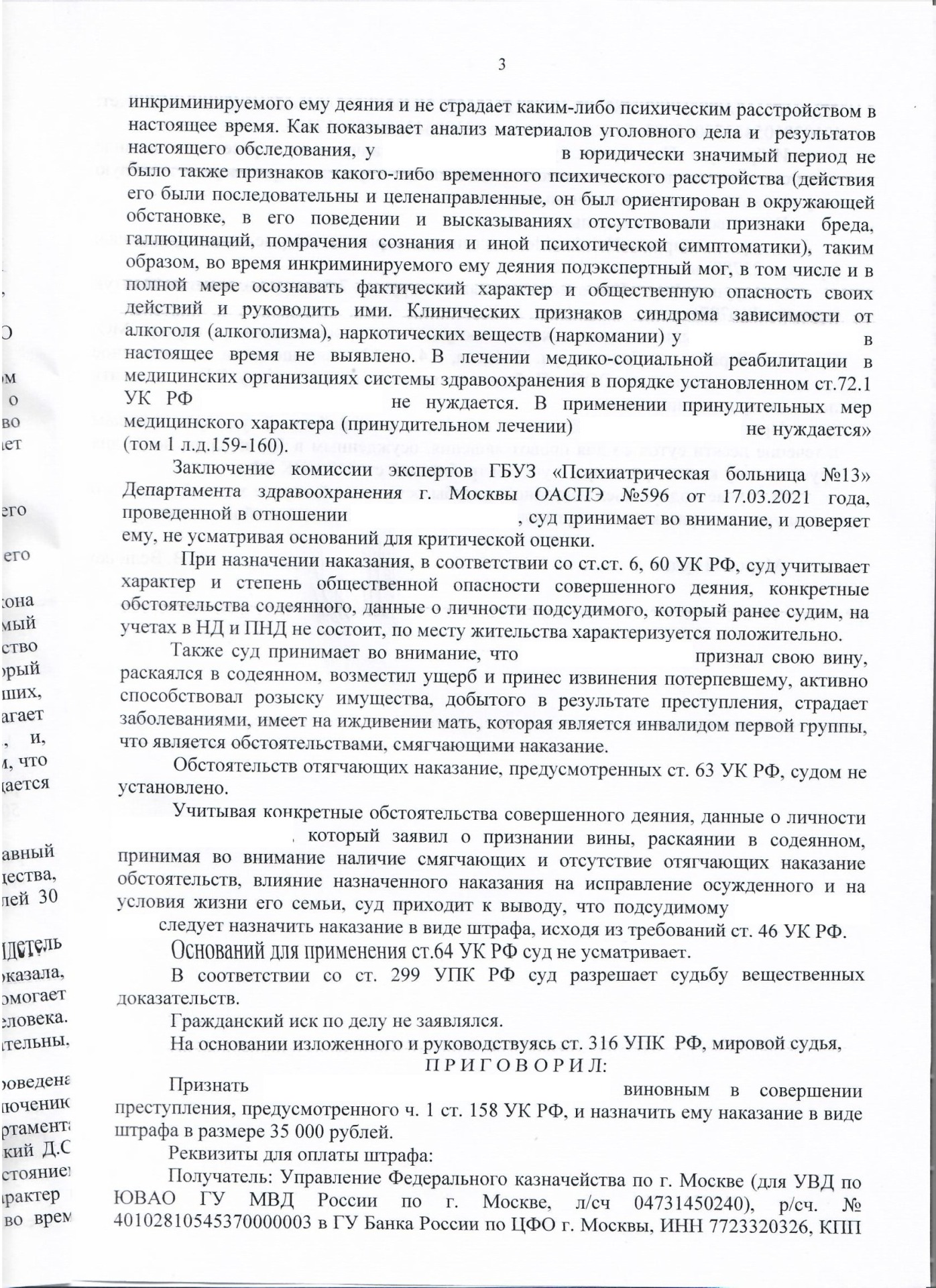 19 мая 2021 года прокурор попросил 8 месяцев лишения свободы условно. «Условку» очень не хотел мой подзащитный (январский «условный» приговор в марте 2021 года в апелляции удалось изменить на штраф 30 000 рублей). Адвокат по уголовным делам в Москве просил штраф в размере 5 000 рублей. Суд дал штраф 35 000 рублей, что устроило моего подзащитного.
