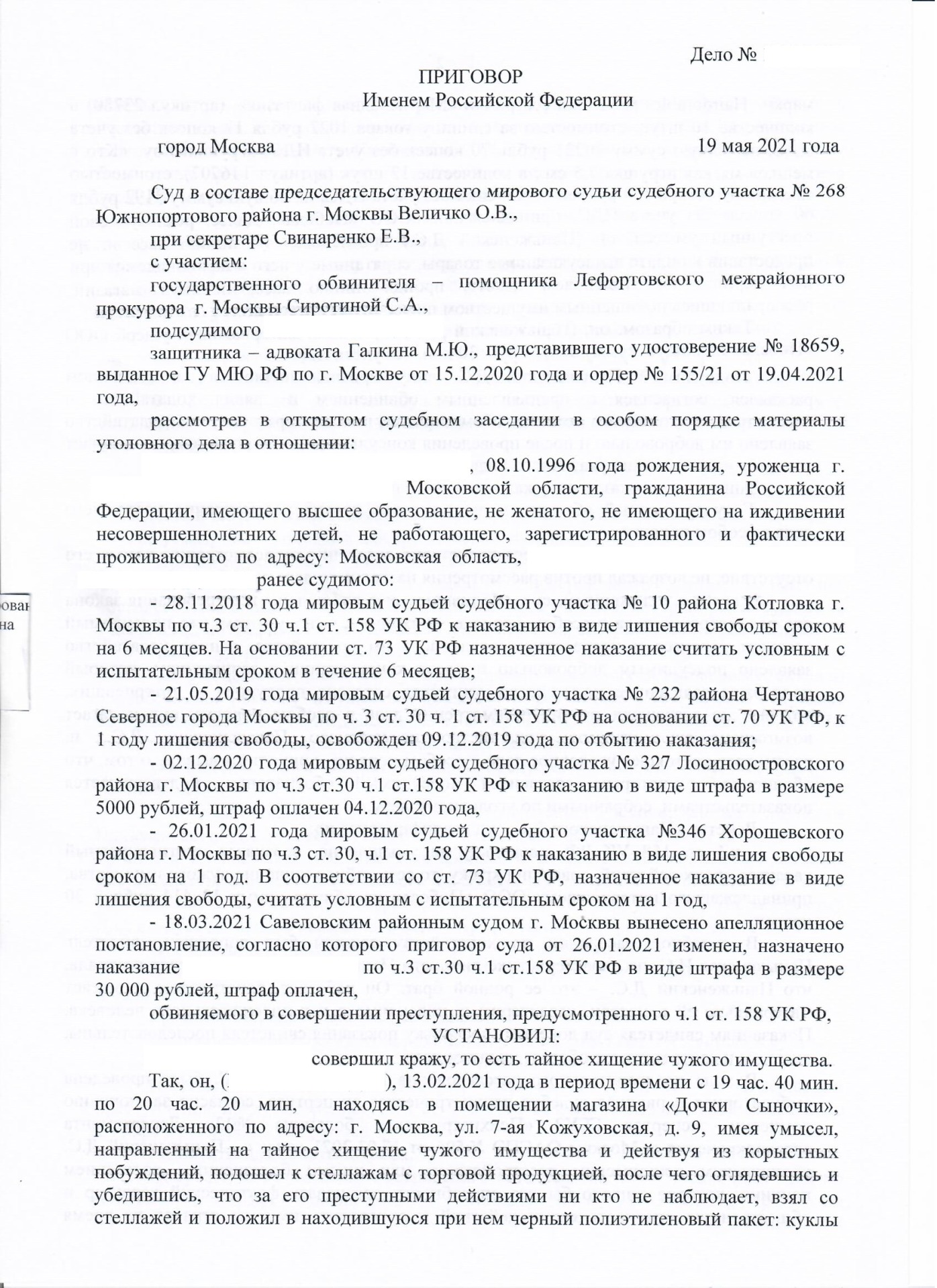 Как адвокат по уголовным делам в Москве я беспокоился по поводу размера наказания. Это 9е привлечение к уголовной ответственности за кражи игрушек из магазинов лица 1996 г.р. И 3 непогашенные судимости по последним приговорам ухудшали положения моего подсудимого обвиняемого в краже. Да и в этот раз в отличие от прошлых был оконченный состав преступления.