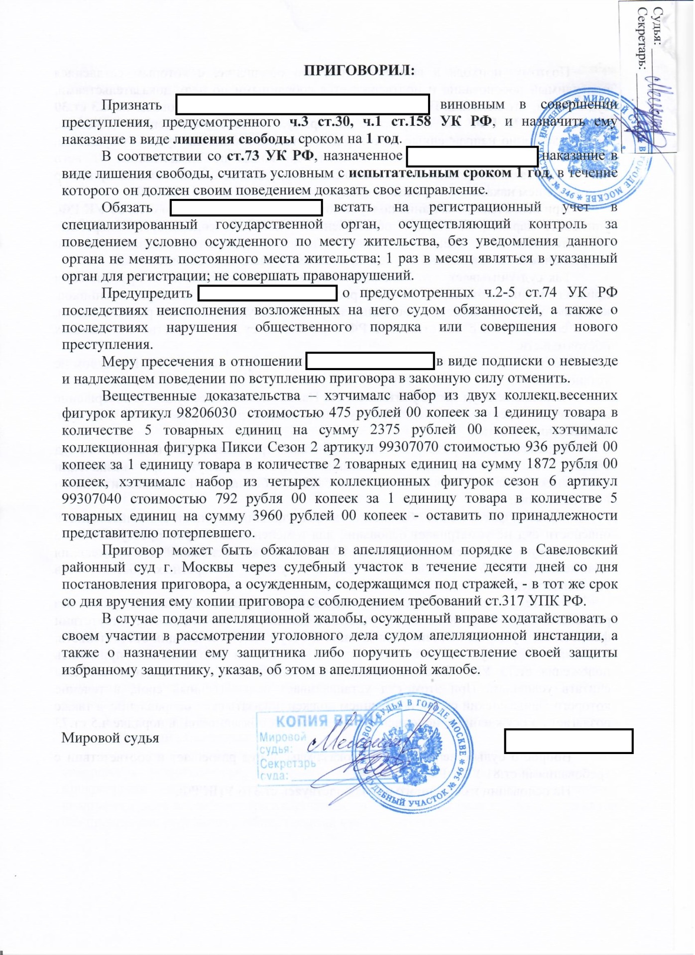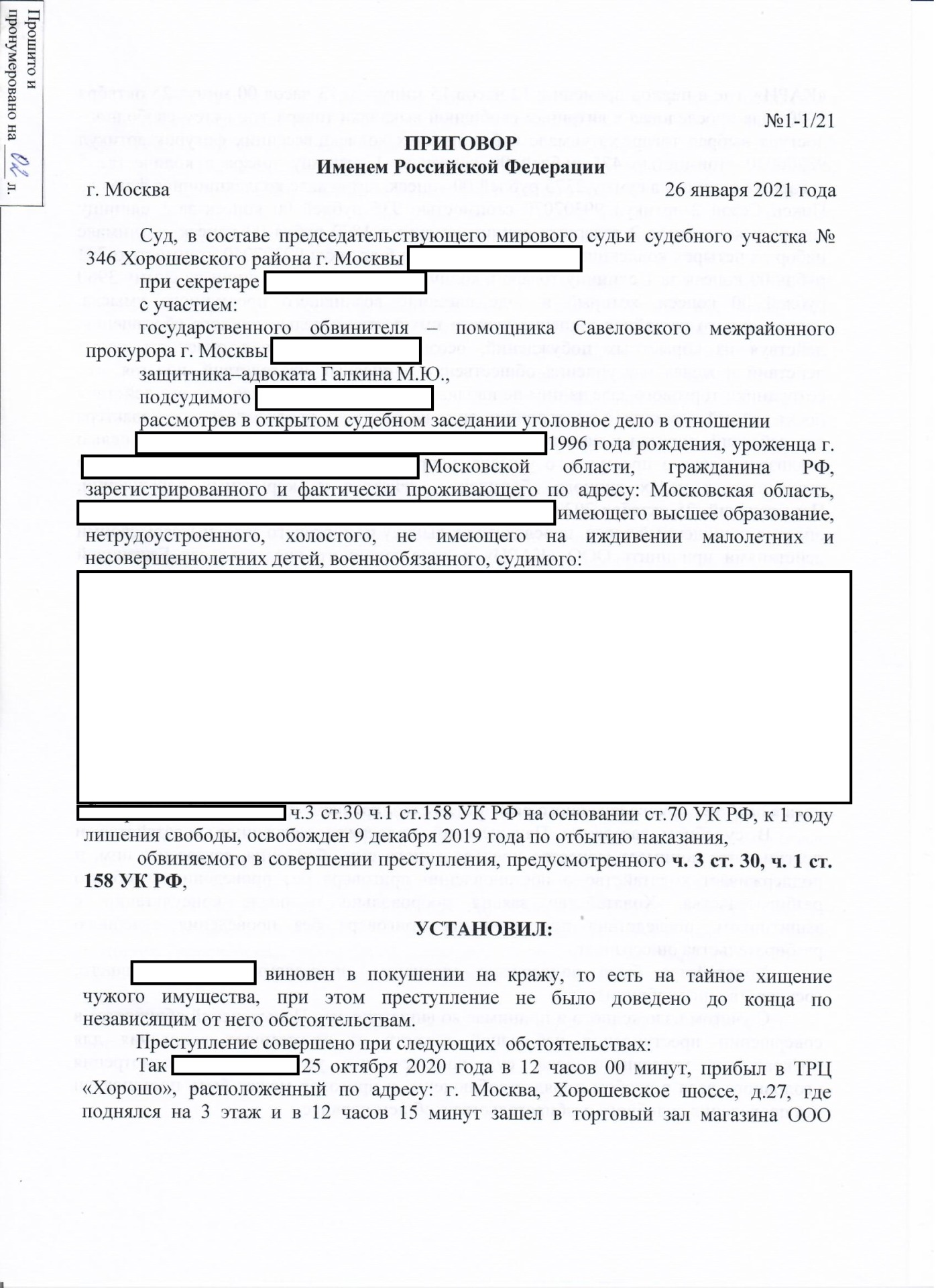 26 января 2021 года адвокат по уголовным делам в Москве Галкин Михаил Юрьевич осуществлял защиту подсудимого, обвиняемого в покушении на кражу. Уголовному делу в судебном участке мирового судьи Хорошевского района г.Москвы был присвоен номер 1, а для моего подзащитного 1996 г.р. это стало шестым привлечением к уголовной ответственности за покушение на кражу (ч.3 ст.30, ч.1 ст.158 УК РФ). Покушение потому что поймали на выходе, не успел окончить преступный умысел по независящим от него обстоятельствам.
