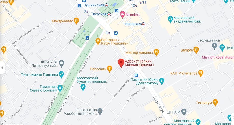 Для удобства жителей разных районов адвокат в ЦАО города Москвы, Галкин Михаил Юрьевич, принимает в офисе коллегии адвокатов «Особое мнение» рядом с Тверской улицей и станциями метро Тверская, Пушкинская, Чеховская по адресу: Москва, Малый Гнездниковский переулок, дом 12/27, строение 3.