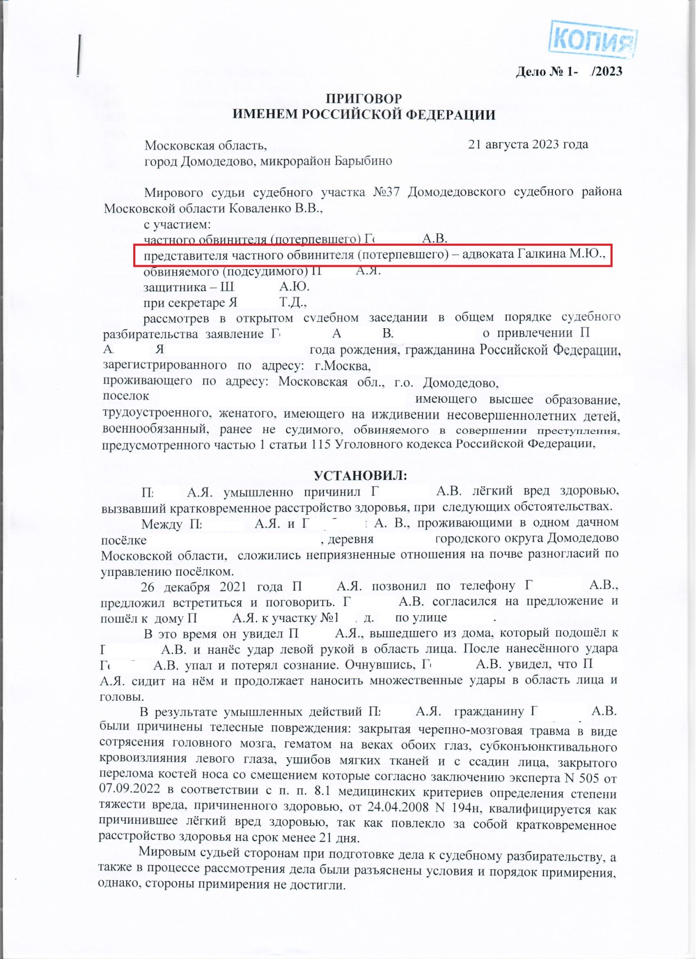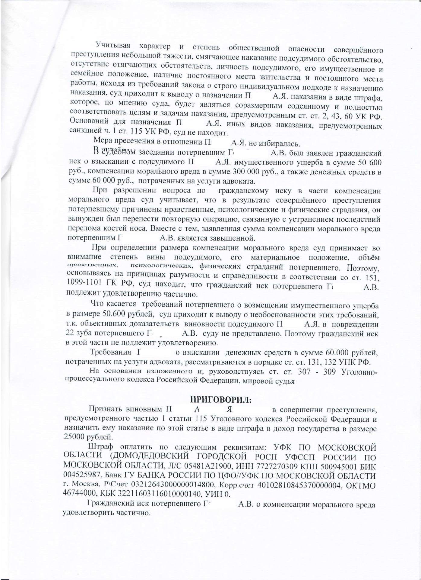 21.08.2023 мировой судья судебного участка № 37 Домодедовского судебного района Московской области вынесла обвинительный приговор подсудимому. Взыскала компенсацию морального вреда в размере 60 000 руб. за сломанный нос, выбитый зуб и другие телесные повреждения, называемыми «лёгкий» вред здоровью.