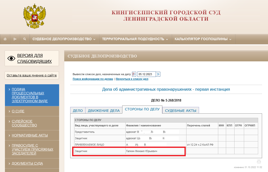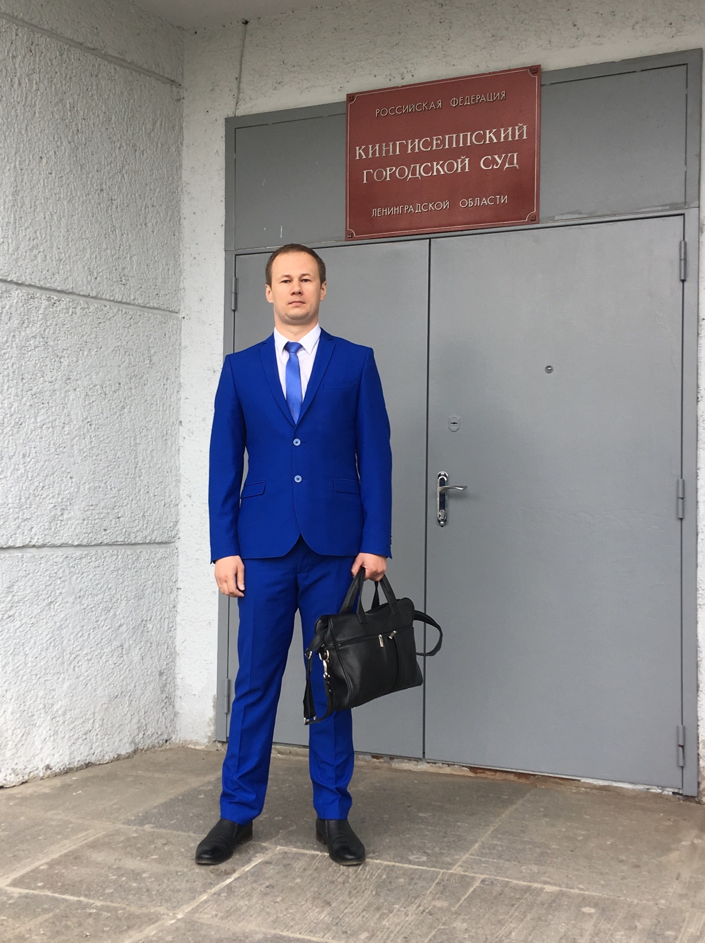 В апреле 2018 дело об административном правонарушении поступило в Кингисеппский городской суд Ленинградской области. Защиту лица, привлекаемого к административной ответственности осуществлял защитник Галкин М.Ю. к немалому удивлению участников дела, что защитник привлекаемого лица приезжает из Москвы. Так как адвокат Галкин М.Ю. уроженец города Нарва, то командировки в Кингисеппский городской суд и участие в суде как юрист в Кингисеппе возможны так же как и в любые другие регионы РФ.
