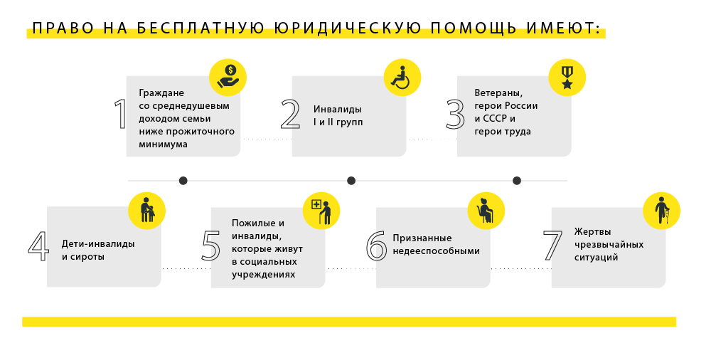 На изображении указаны категории лиц, имеющие право на бесплатную юридическую помощь в государственных юридических бюро, у адвокатов участников программы бесплатной юридической помощи, у студентов в юридических клиниках при высших учебных заведениях.