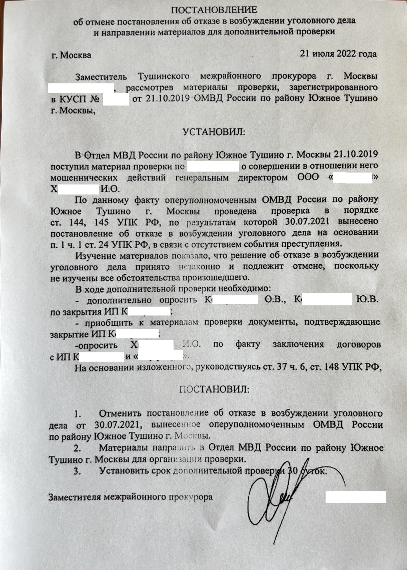 Была подана жалоба в порядке ст. 125 УПК РФ в Тушинский районный суд г. Москвы. В заседание 19.07.22 полиция не предоставила материалы проверки и заседание было отложено. А 25.07.22 в деле оказалось постановление Тушинской прокуратуры от 21.07.22 об отмене постановления об отказе в возбуждении уголовного дела. Третья отмена отказа в возбуждении уголовного дела вновь произведена прокуратурой, но после обращения в суд с жалобой в порядке ст. 125 УПК РФ.