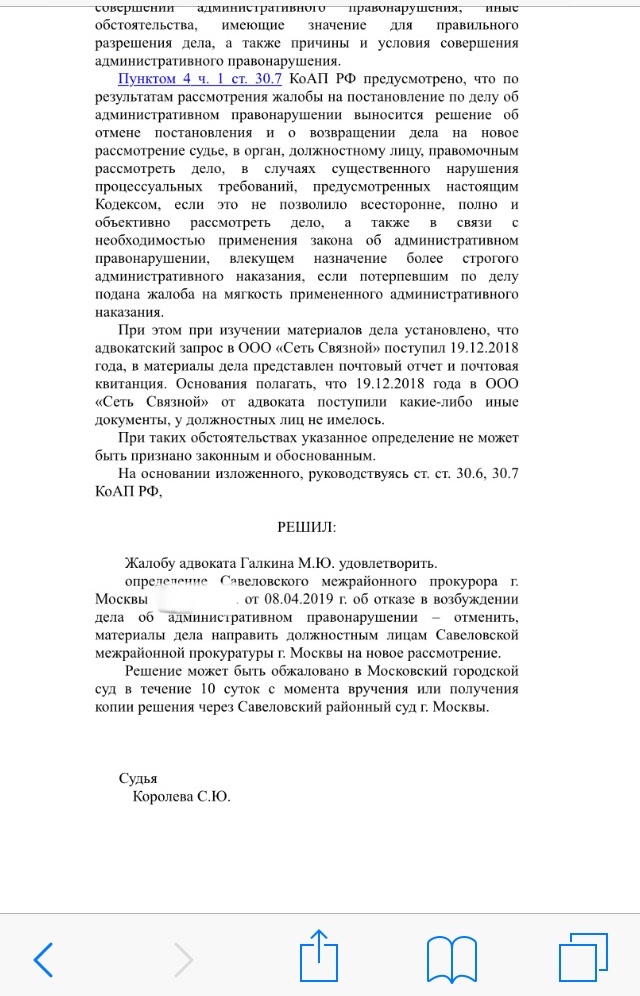 20.03.19 направил в Савёловскую межрайонную прокуратуру заявление о возбуждении дела об административном правонарушении за неправомерный отказ в предоставлении информации на адвокатский запрос. 08.04.19 Савёловская межрайонная прокуратура г.Москвы вынесла определение об отказе в возбуждении дела об административном правонарушении, ссылаясь на объяснения ООО «Сеть Связной» якобы им неизвестно, что именно было в письме от адвоката Галкина М.Ю.
