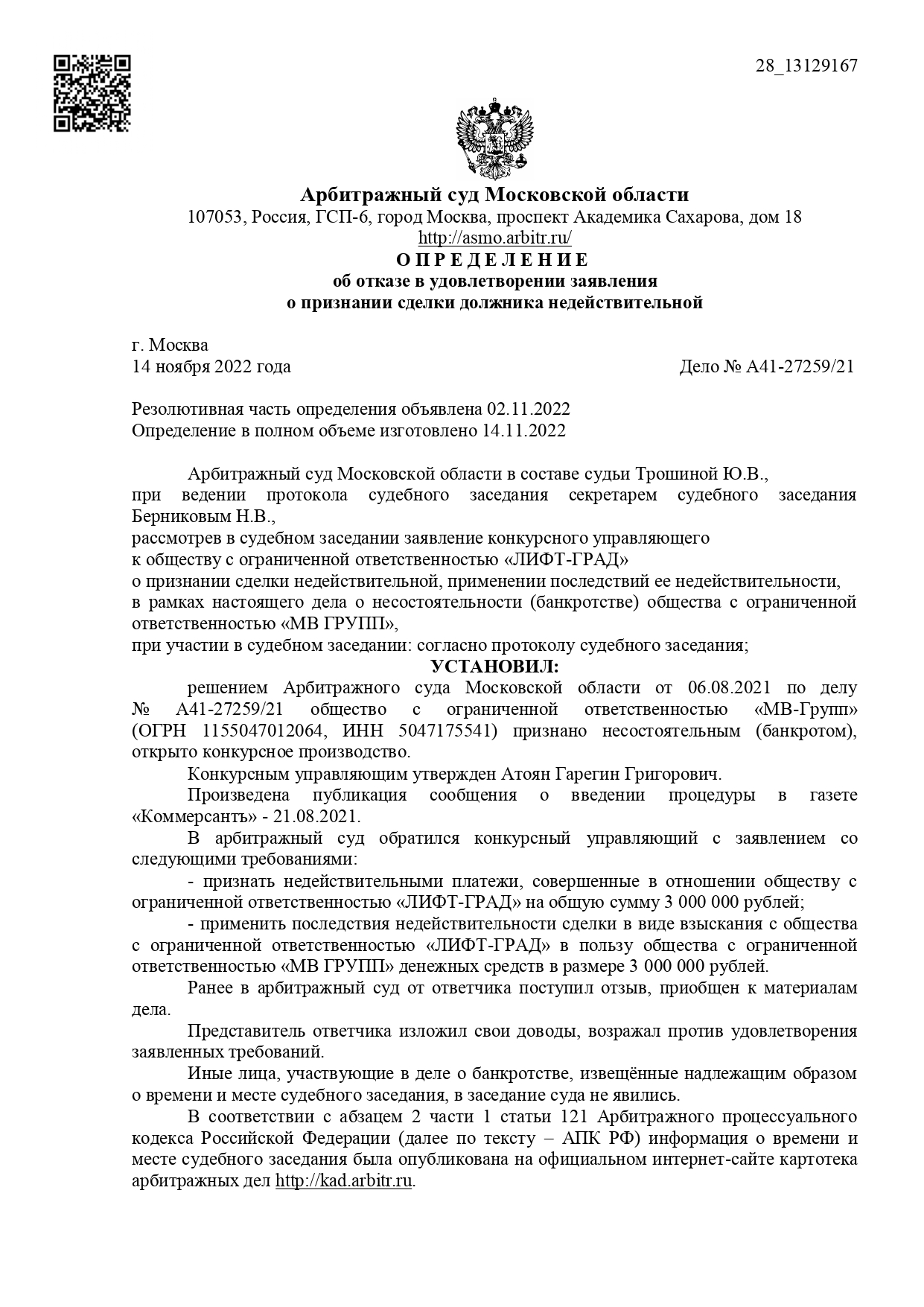 Отказ в удовлетворении заявления конкурсного управляющего о признании сделки должника недействительной. Дело А41-27259/21, Арбитражный суд Московской области.