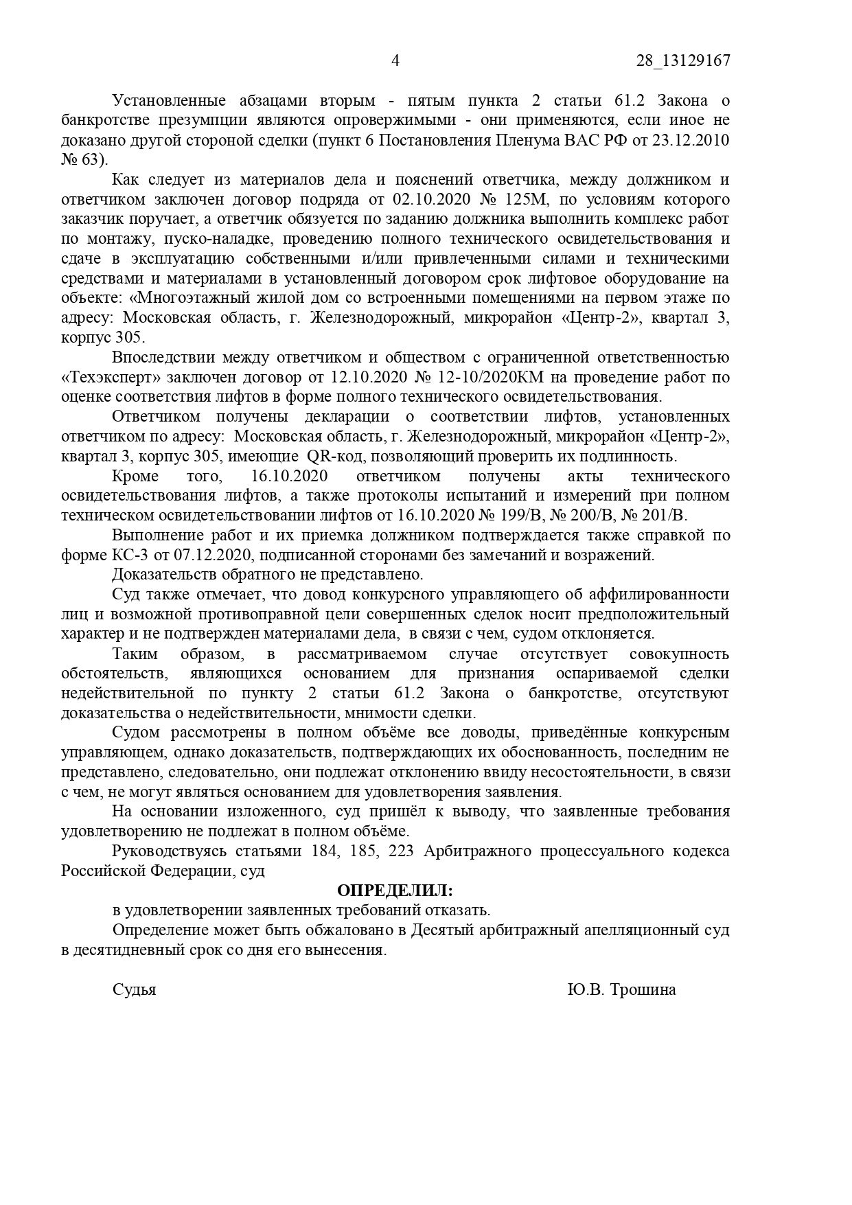 Адвокат по арбитражным делам в виде оспаривания сделок должника при банкротстве Галкин М.Ю. составил мотивированные возражения на заявление конкурсного управляющего и поддержал их в двух судебных заседаниях. Судья досконально изучила доводы возражений, приложенные документы, выяснила интересующие вопросы и вынесла определение об отказе в удовлетворении заявления конкурсного управляющего о признании сделки должника недействительной в рамках банкротства.