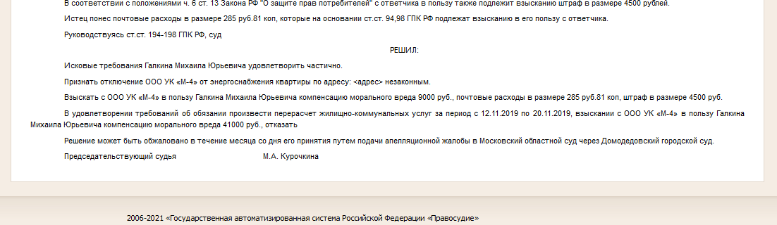 Адвокат в Домодедово Михаил Галкин был вынужден защищать самого себя, со стороны ООО УК «М-4» был целый ряд нарушений закона при отключении энергоснабжения, в том числе процедуры отключения энергоснабжения.