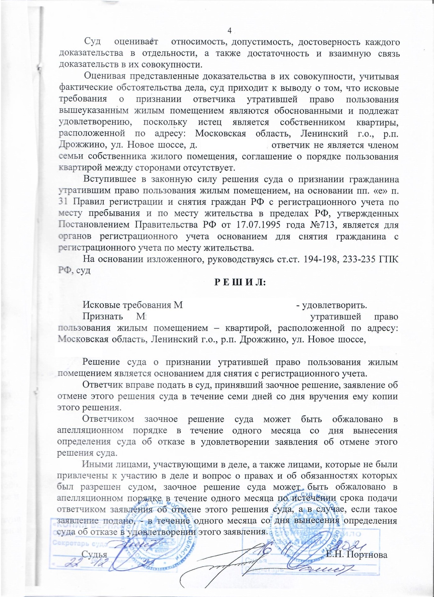 Признание утратившим право пользования жилым помещением и снятие с регистрационного учета в квартире Видновский городской суд 05.10.2021