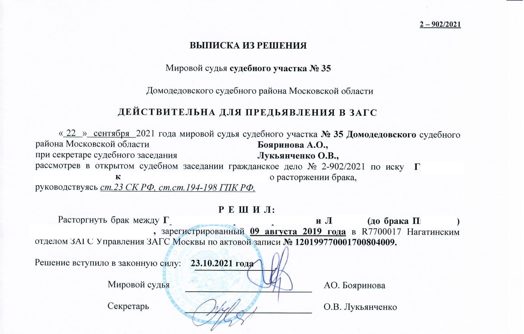 18.06.2021 г. иск о расторжении брака поступил судебный участок мирового судьи №35 Домодедовского судебного района Московской области. На первом судебном заседании в июле ответчица не присутствовала, ответы на запросы суда не поступили. На следующем судебном заседании в августе ответчица возражала против развода. В судебном заседании 22.09.2021 г. брак был расторгнут. 23.10.2021 г. решение суда о расторжении брака вступило в законную силу.