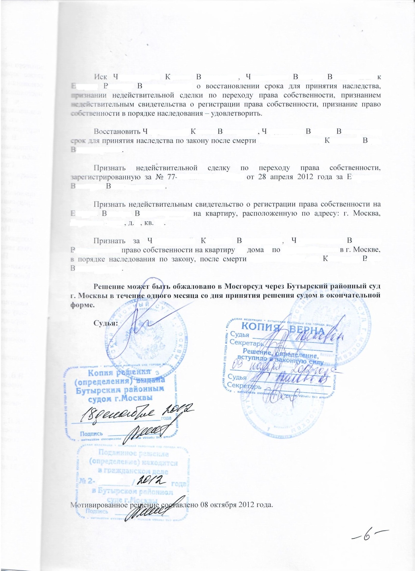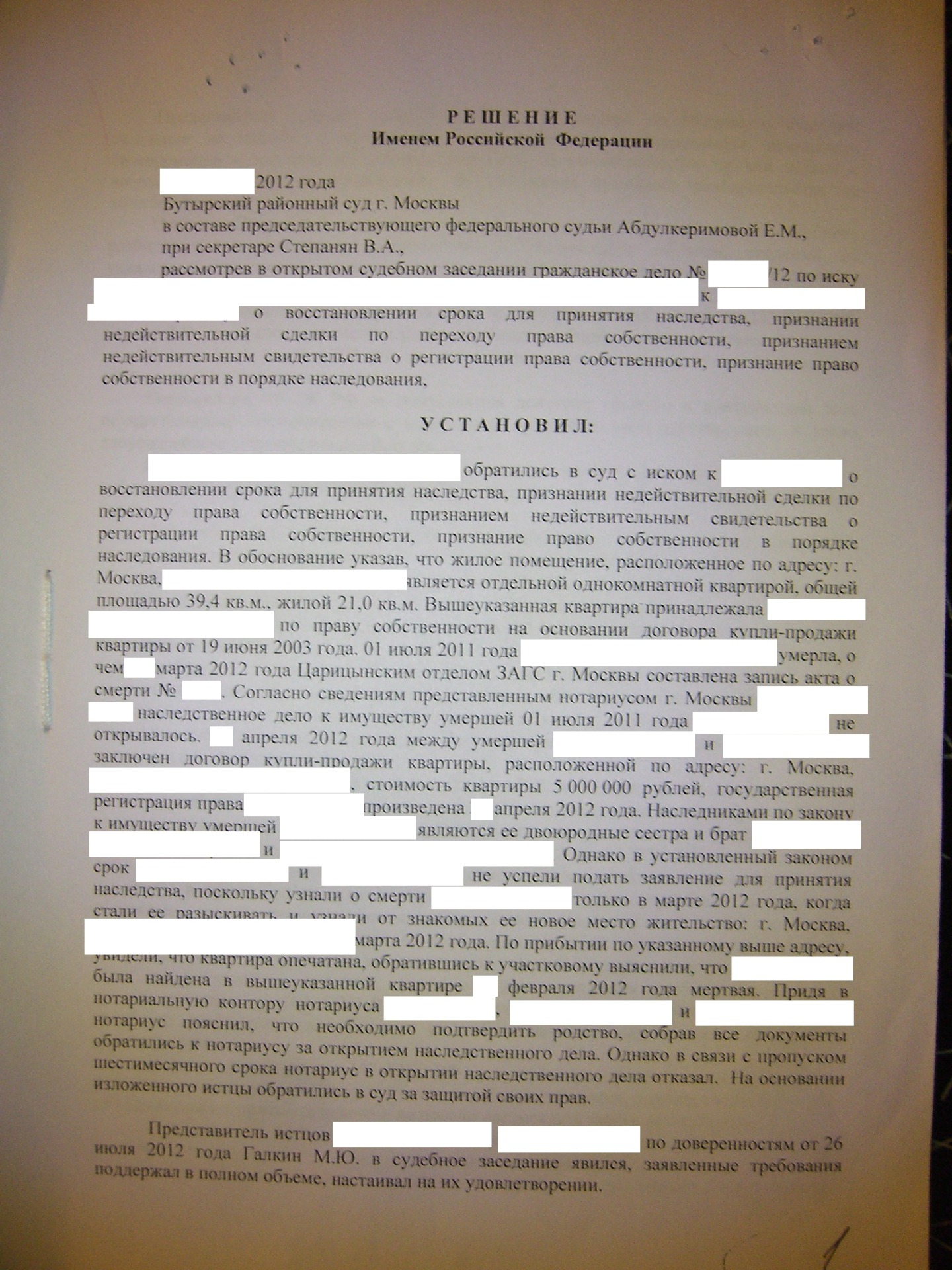 В Бутырский районный суд города Москвы были заявлены исковые требования: восстановление срока для принятия наследства, признание недействительной сделки по переходу права собственности, признание недействительным свидетельства о регистрации права собственности, признание право собственности в порядке наследования.
