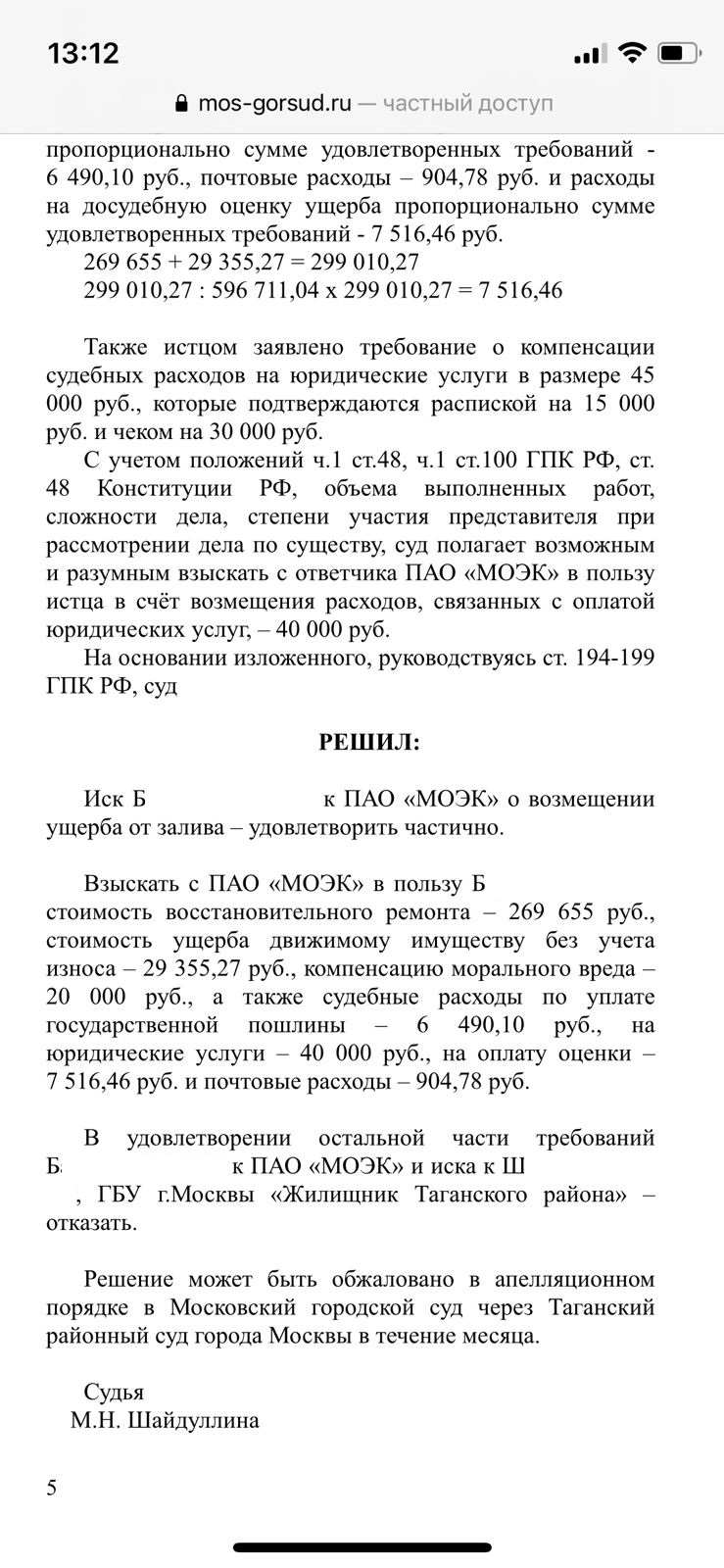 Возмещение ущерба заливом квартиры в Таганском суде с МОЭК