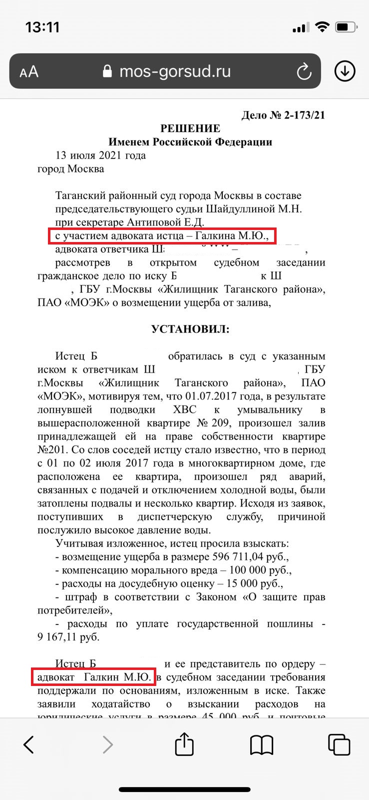 В феврале 2021 года истец и адвокат по гражданским делам в Москве Галкин М.Ю. заключили соглашение на участие при проведении экспертизы и предстоящих судебных заседаниях. Стоимость услуг адвоката по заливу стороны оценили в 30 000 рублей.