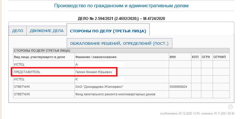 Иск о возмещении ущерба от залива квартиры на улице Корнеева в июне 2020 года был подан к управляющей компании в Домодедовский городской суд Московской области 26 ноября 2020 года. Управляющая компания просила привлечь третьим лицом Фонд капитального ремонта и соответчиком подрядчика, производившего капитальный ремонт многоквартирного дома по заказу Фонда капремонта. Адвокат по гражданским делам в Домодедово Галкин Михаил Юрьевич возражал, так как отношения с подрядчиком следует выяснять после удовлетворений требований собственника квартиры, у которого нет никаких отношений с подрядчиком работ, а есть договорные отношения с управляющей компанией и взносы в Фонд капремонта. Суд согласился с позицией адвоката и привлёк в соответчики Фонд капремонта, подрядчика третьим лицом.