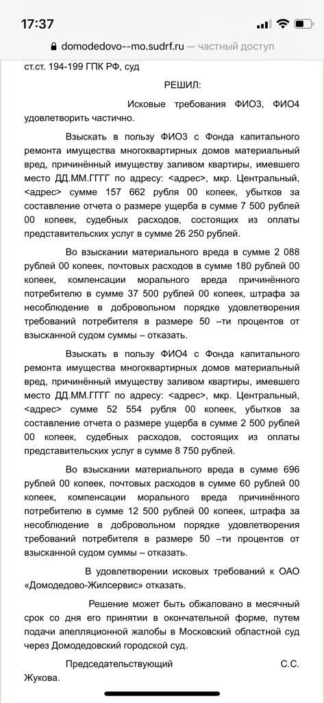 25 июня 2021 года Домодедовский городской суд взыскал 210 000 руб. в счёт возмещения ущерба от залива квартиры с Фонда капитального ремонта общего имущества многоквартирных домов. По времени с подачи иска до вынесения решения суда по делу о возмещении ущерба от залива в Домодедово прошло семь месяцев.