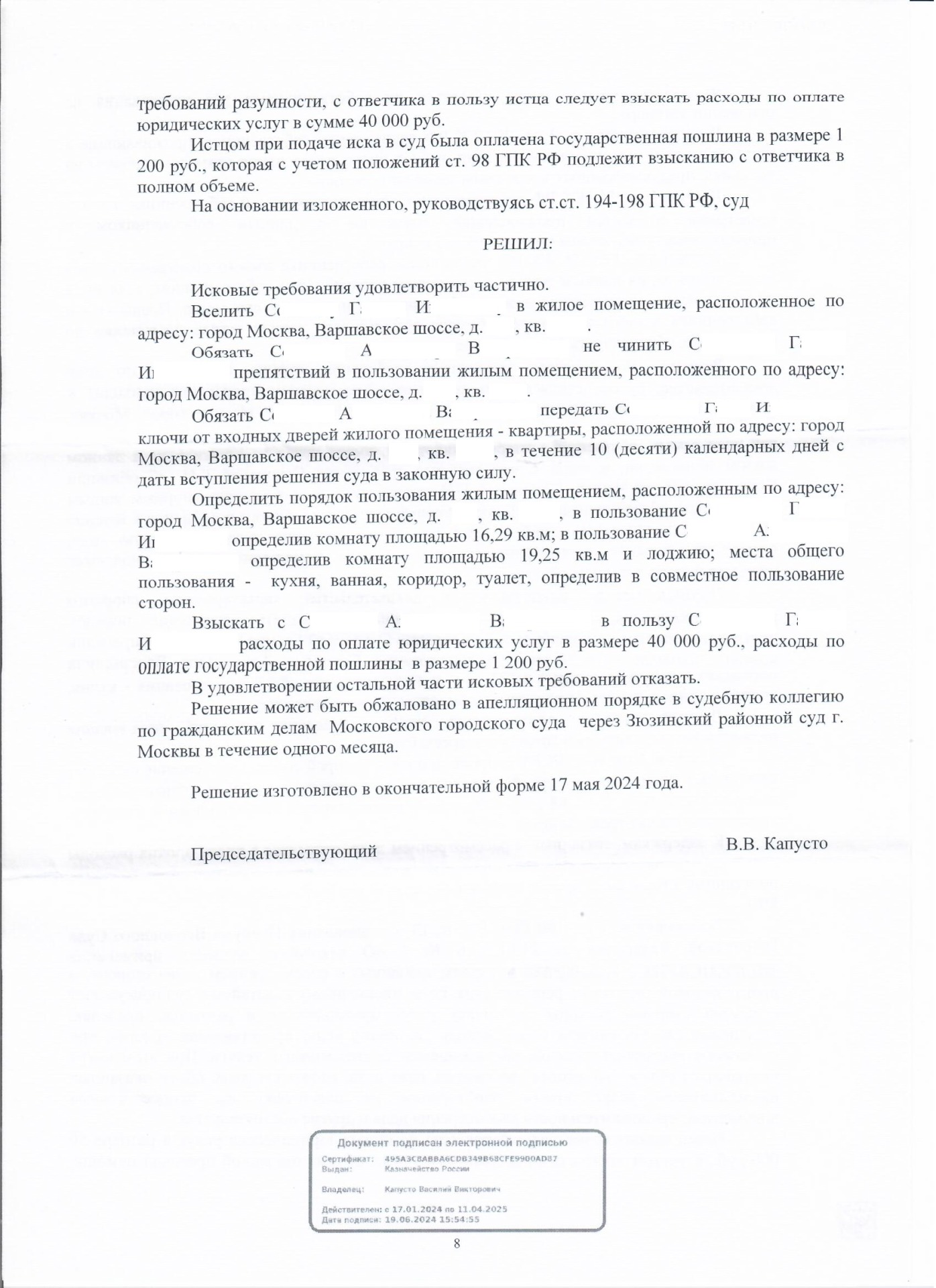 В результате, почти через год после подачи иска, 13.05.2024 г. судом полностью удовлетворены исковые требования истца в части касающейся жилого помещения. А расходы на юридические услуги суд удовлетворил частично, взыскав 40 000 руб.