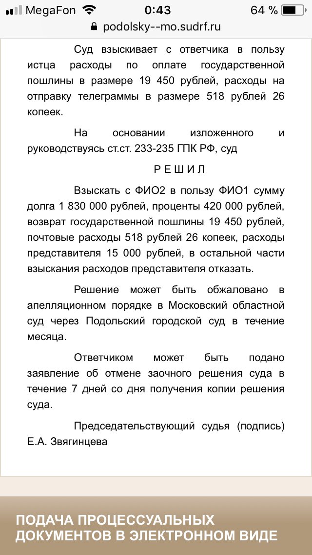Был под иск о взыскании долга в Подольский городской суд Московской области. Должник ответчик в судебные заседания не являлся. Суд исследовав расписку решил взыскать в пользу С.К.В. сумму долга 1 830 000 рублей, проценты 420 000 рублей, возврат государственной пошлины 19 450 рублей, почтовые расходы 518 рублей 26 копеек, расходы представителя снизил до 15 000 рублей.
