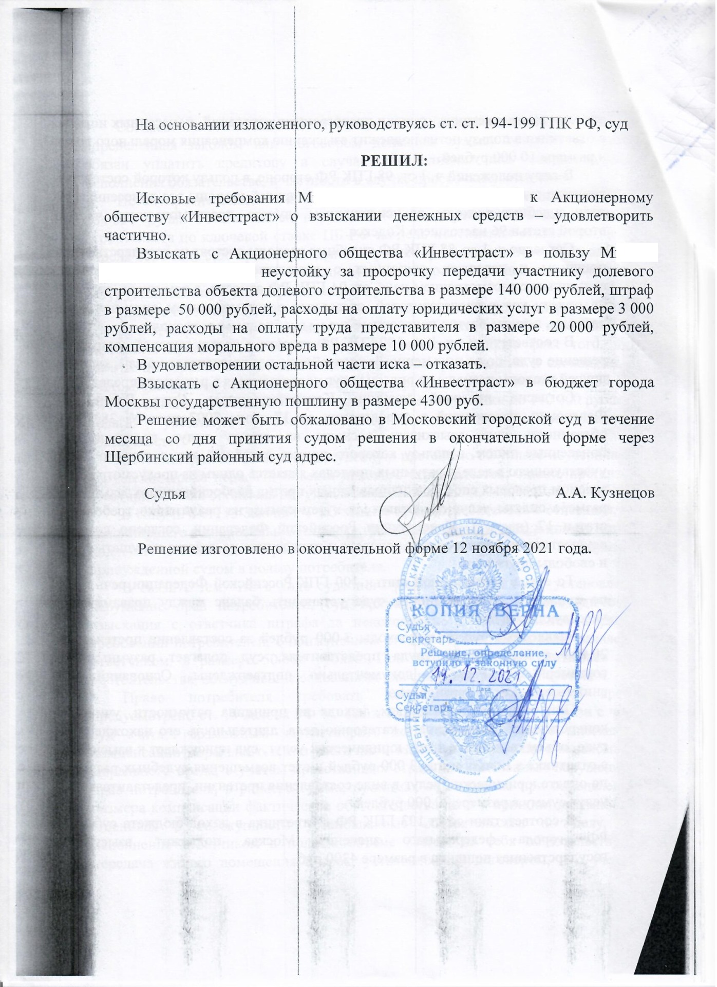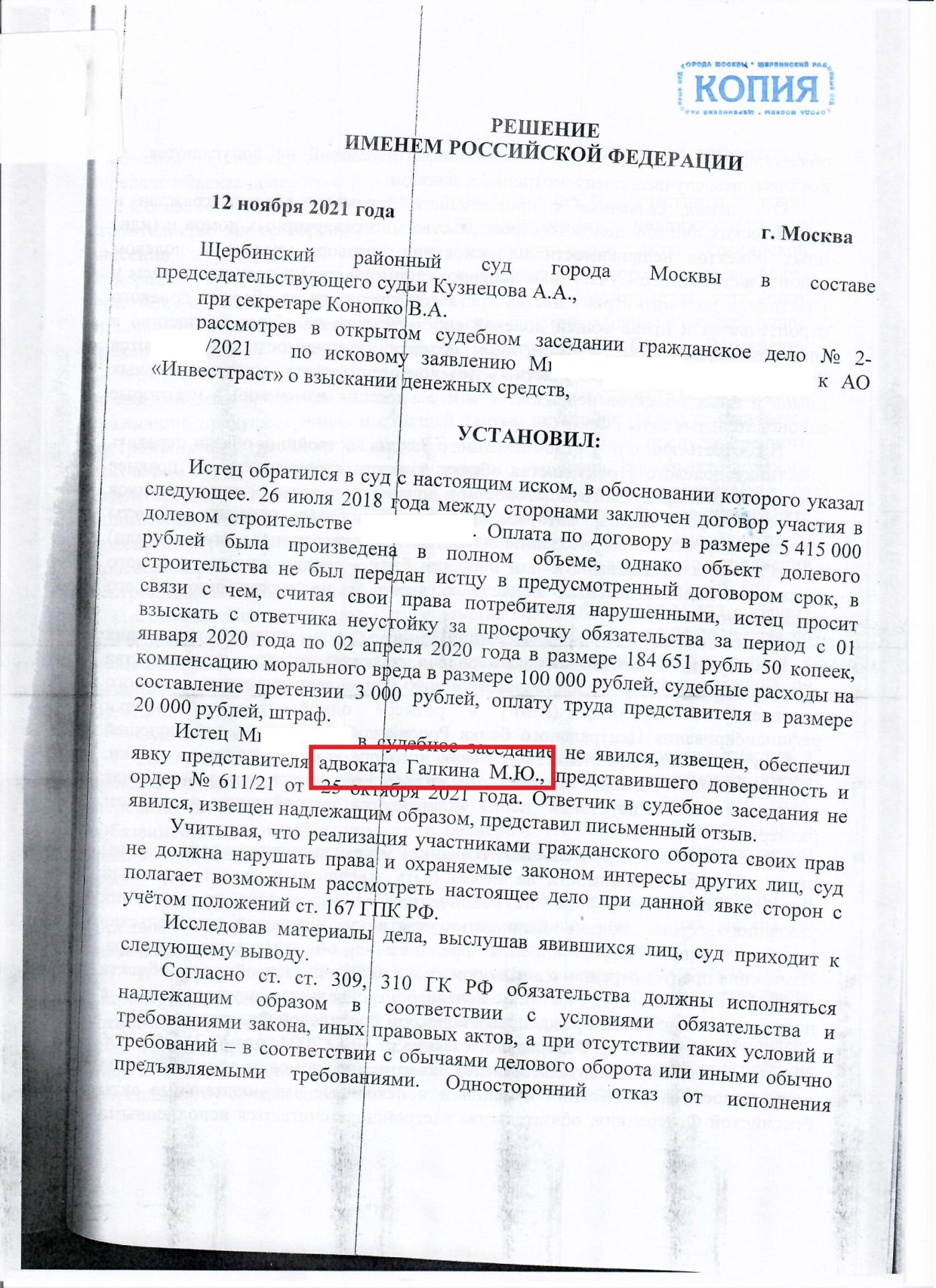 12.11.2021 года адвокат в Щербинке взыскал неустойку по ДДУ с застройщика проекта Новые Ватутинки АО «Инвесттраст» в размере 140 т. руб., моральный вред 10 т. руб., штраф 50 т. руб., юридические расходы в полном объёме 23 т. руб.
