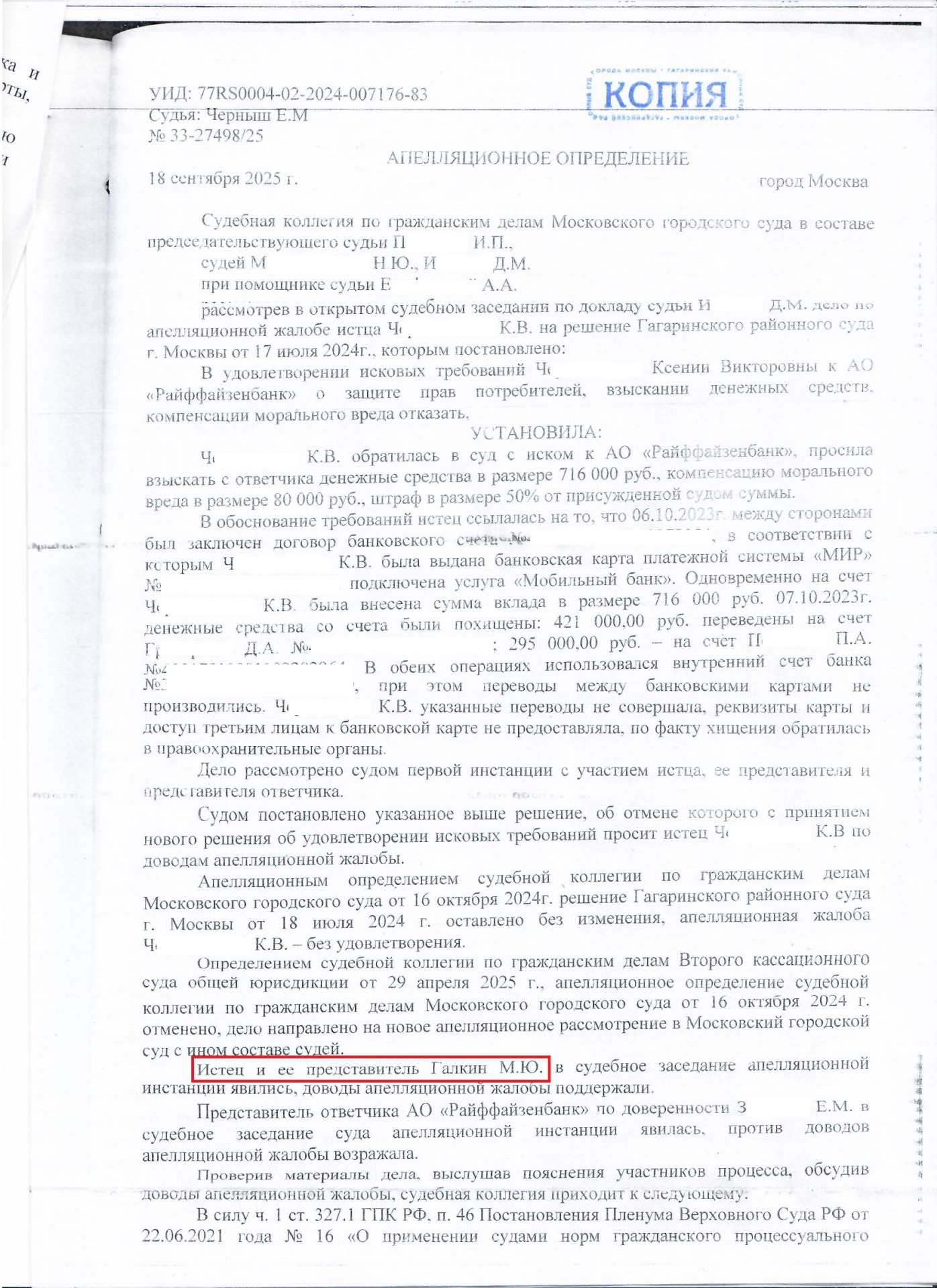 В мае 2024 Ч. обратилась за профессиональной юридической помощью. Адвокат по защите прав потребителей в Москве Галкин Михаил Юрьевич составил исковое заявление в Гагаринский районный суд г. Москвы о взыскании денежных средств.