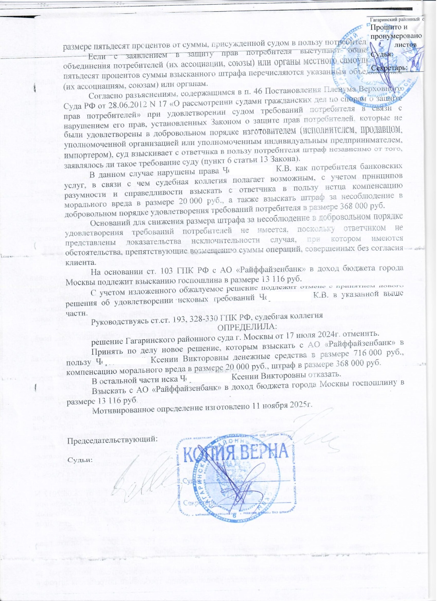В итоге Московский городской суд в сентябре 2025 г. решил взыскать с банка деньги, украденные мошенниками, и штраф в размере половины суммы по закону «О защите прав потребителей».