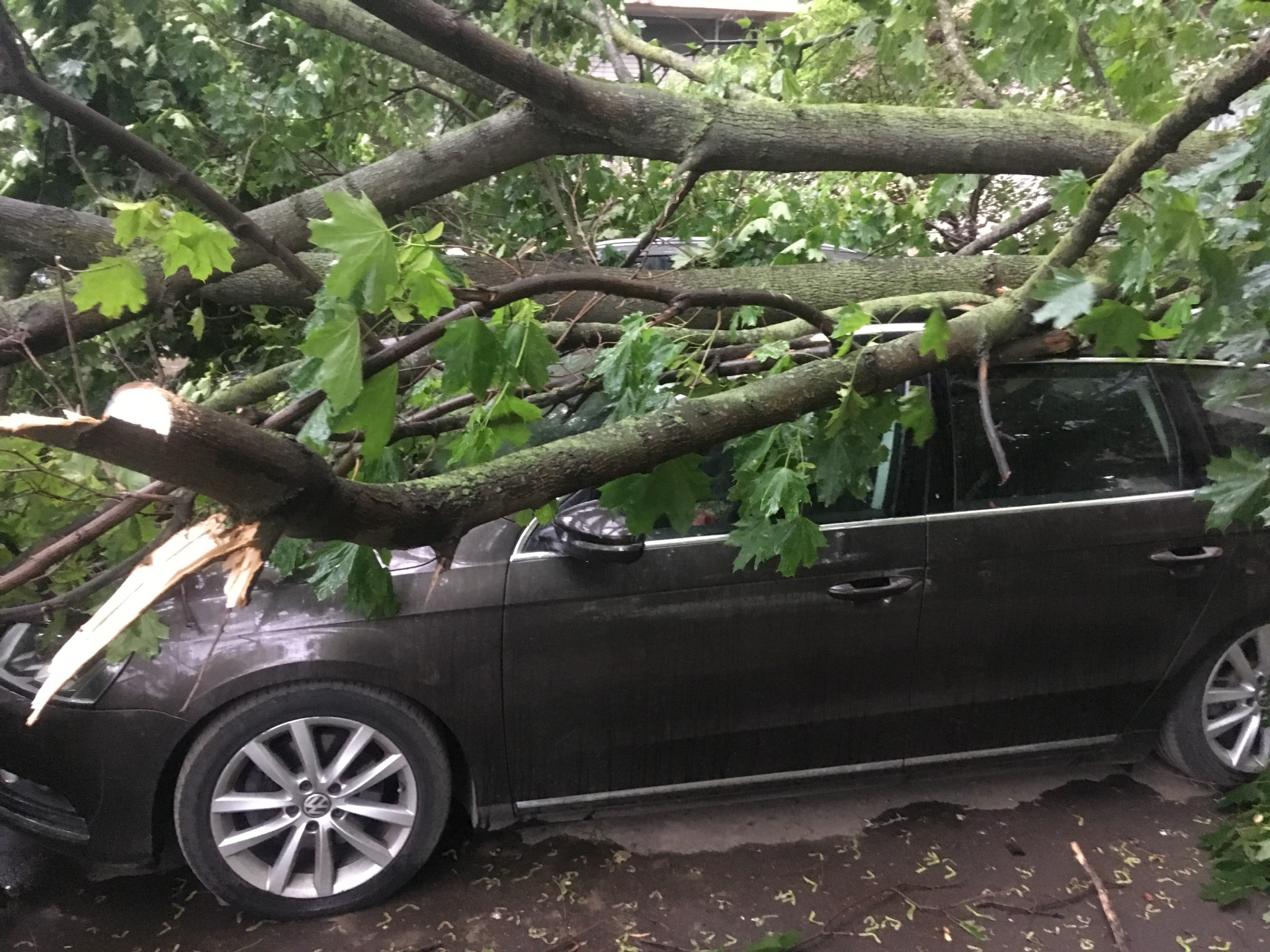 Если на автомобиль упало дерево, вызовите полицию, зафиксируйте факт причинения вреда автомобилю, оцените ущерб и предъявляйте претензию организации осуществляющей содержание территории.