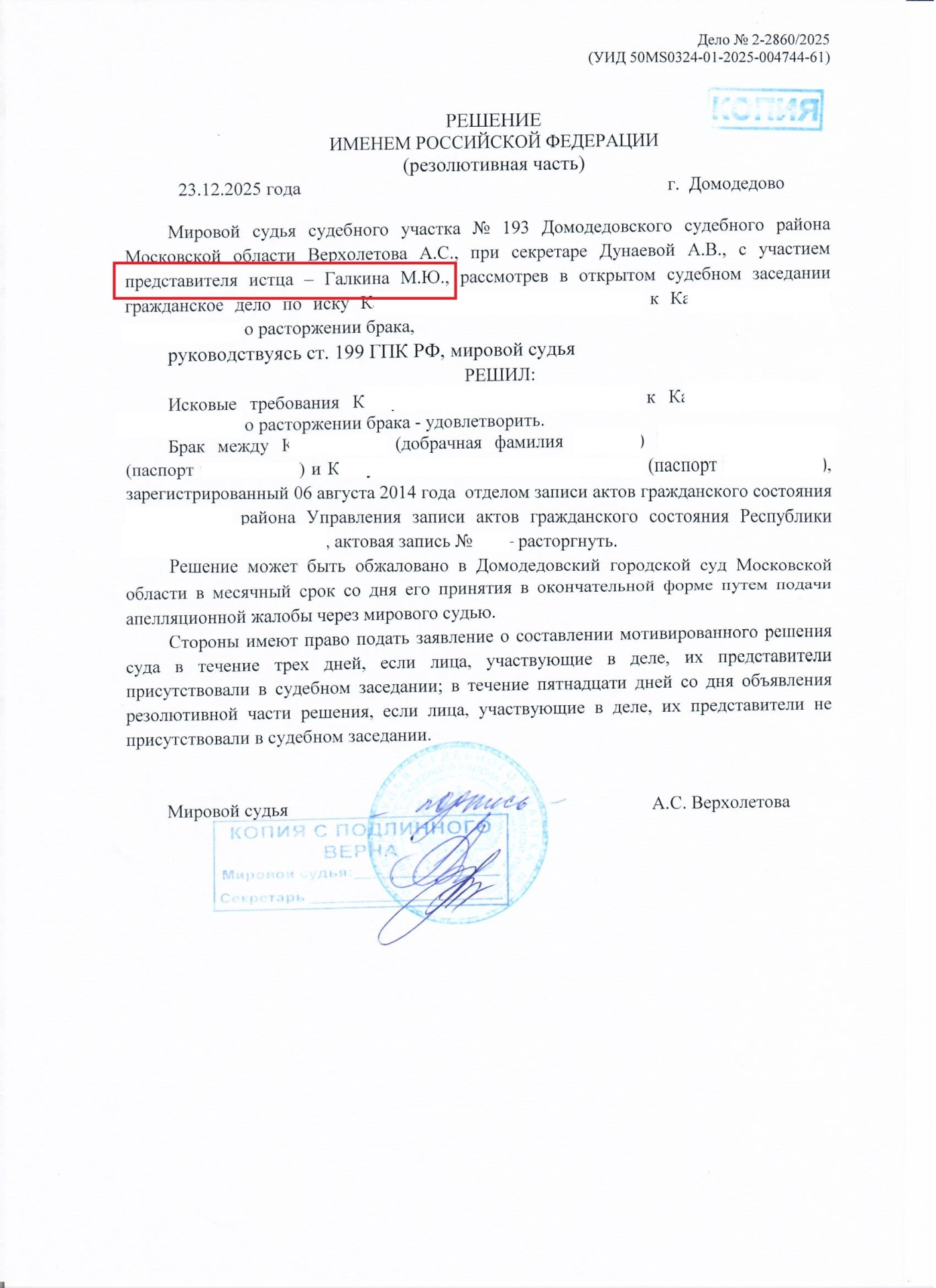 В ноябре 2025 года юрист по разводам в Домодедово Галкин Михаил Юрьевич составил иск о расторжении брака в судебный участок мирового судьи № 193 Домодедовского судебного района Московской области.
