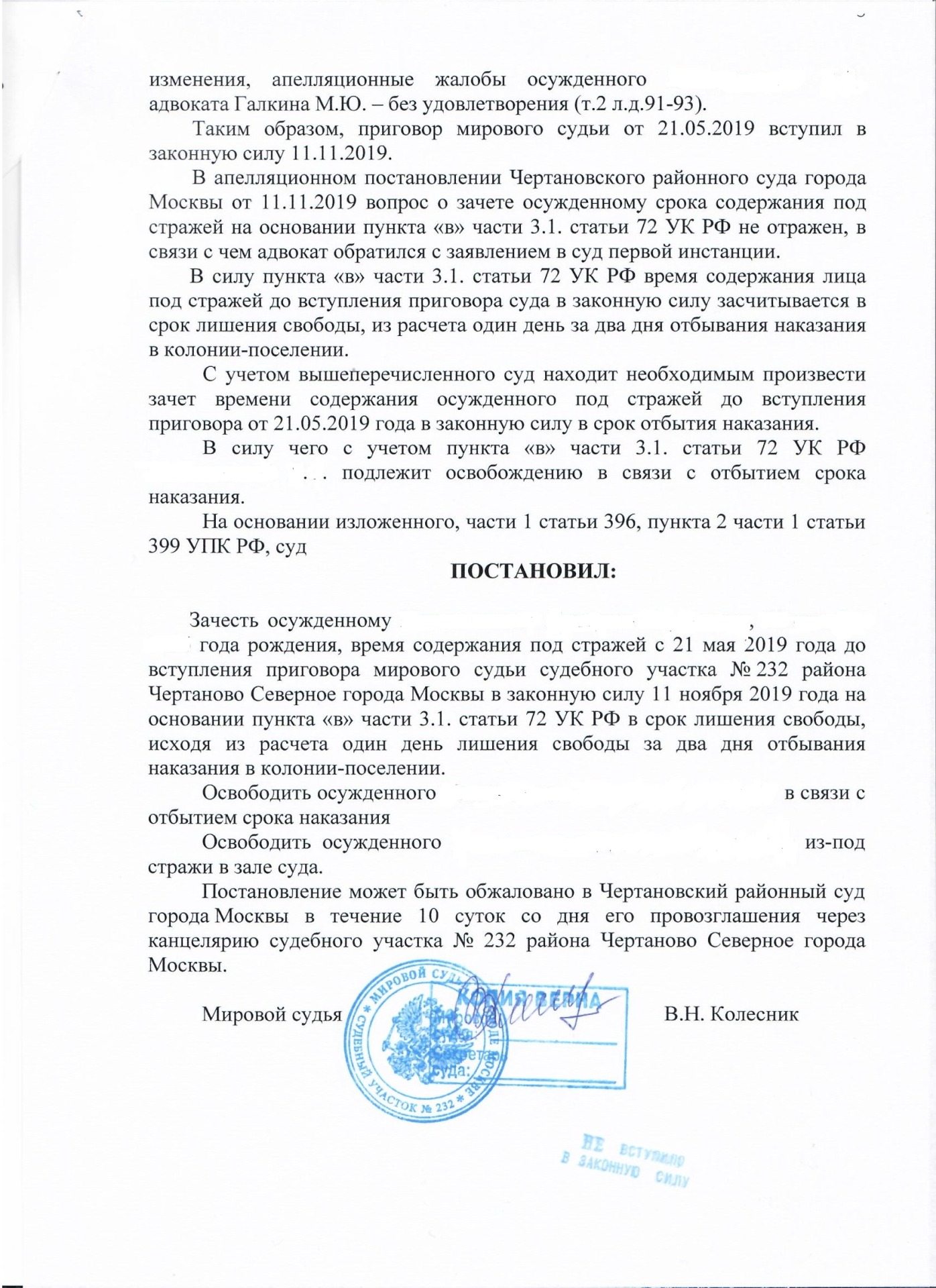 15.10.2019 г. мировой судья района Чертаново Центральное восстановил срок на апелляционное обжалование приговора. 11.11.2019 г. Чертановский районный суд Москвы оставил приговор без изменений, апелляционные жалобы осужденного П. и его защитника адвоката Галкина М.Ю. без удовлетворения.