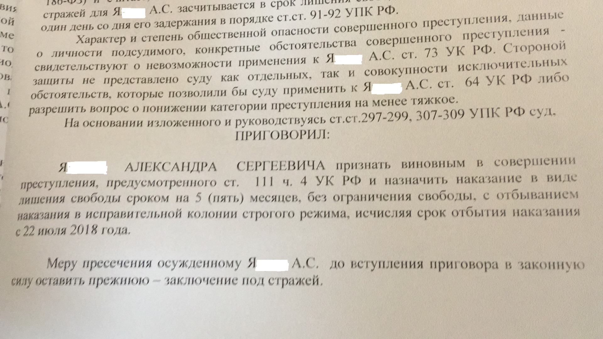 Я.А.С. обвинялся по ст.111 ч.4 УК РФ умышленное причинение тяжкого вреда здоровью, опасного для жизни человека повлекшего за собой по неосторожности смерть потерпевшего, что наказывается лишением свободы на срок до пятнадцати лет с ограничением свободы на срок до двух лет либо без такового. Данная статья относится к категории особо тяжких.