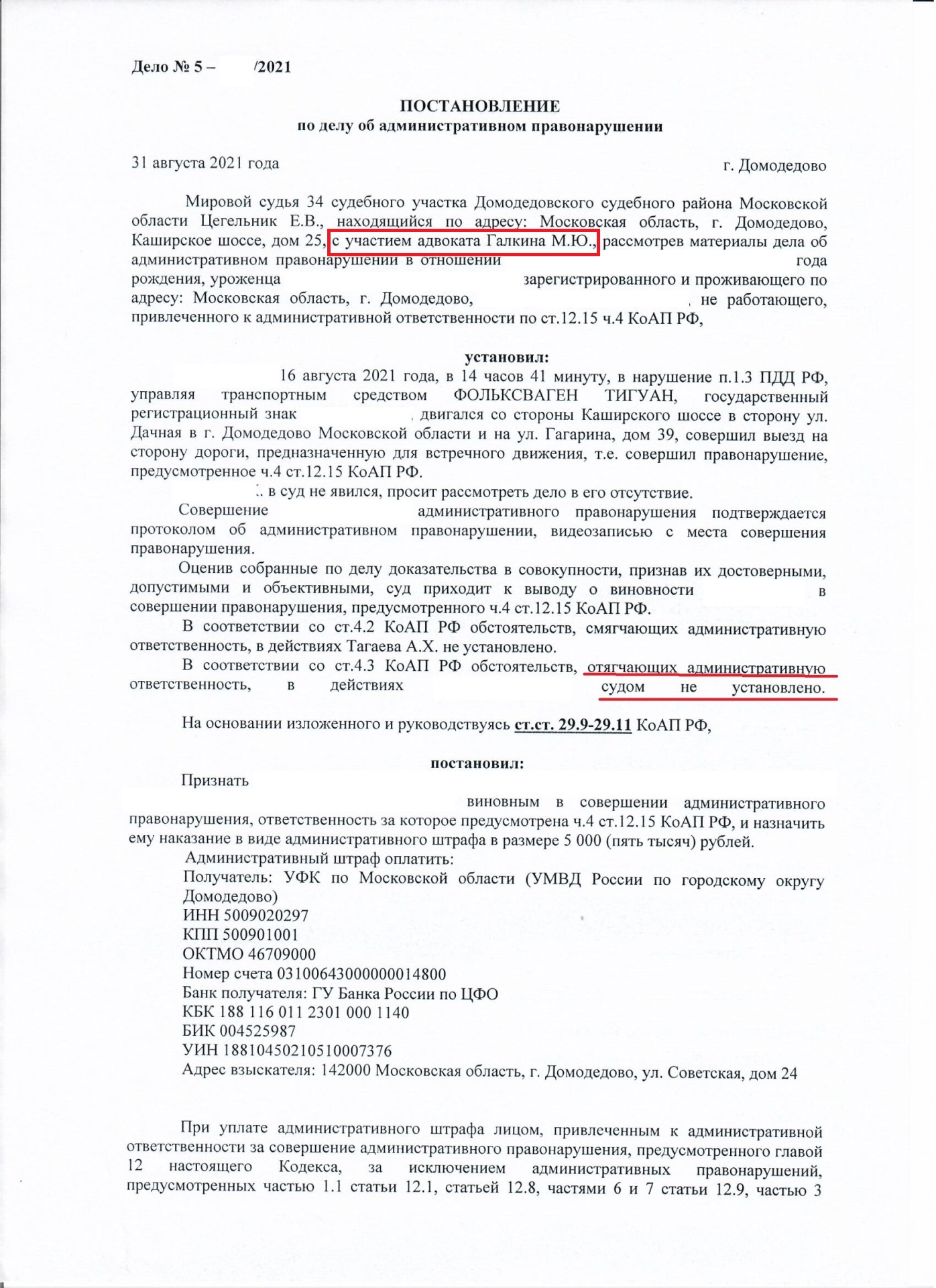 31.08.2021 года мировой судья вынесла постановление о назначении административного штрафа в размере 5 000 рублей. Как указано в постановлении: «обстоятельств, отягчающих административную ответственность, судом не установлено».