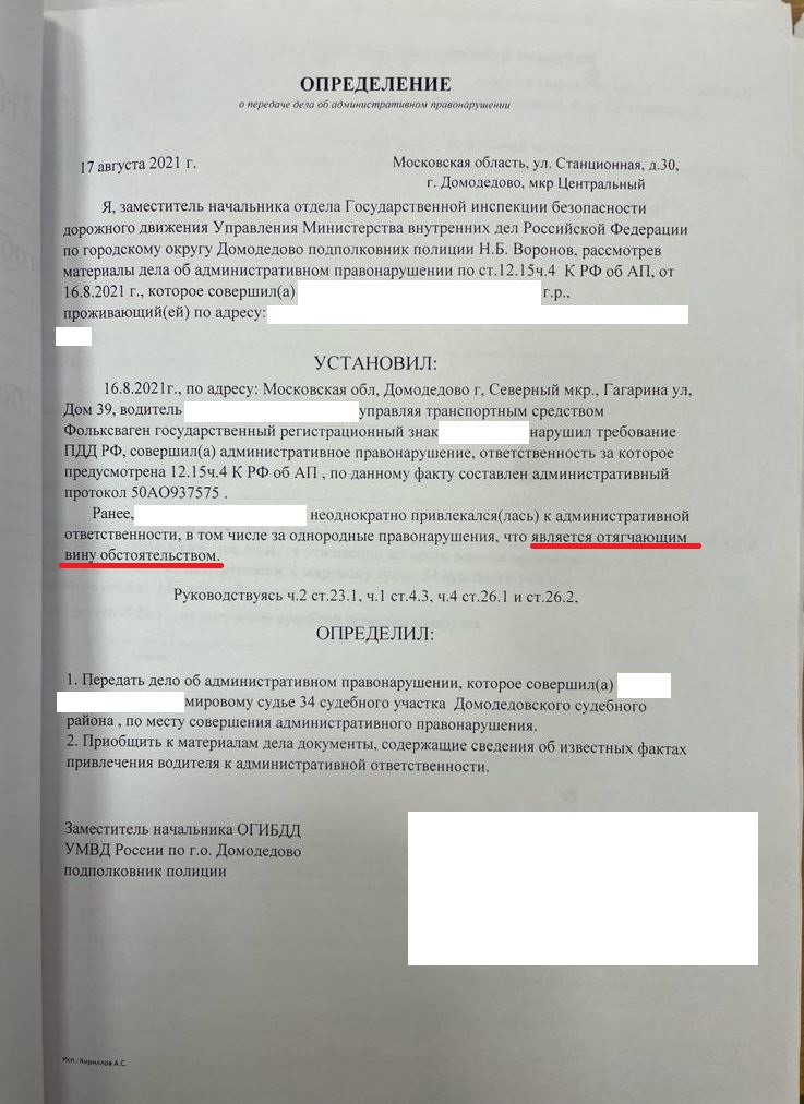 В определении о передаче дела об административном правонарушении в судебный участок мирового судьи, сотрудник ГИБДД указал, что водитель «ранее неоднократно привлекался к административной ответственности, в том числе за однородные правонарушения, что является отягчающим обстоятельством». Адвокат в Домодедово был не согласен с такой "отягчающей" формулировкой.